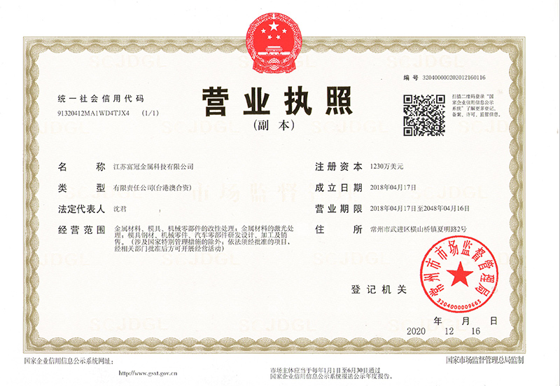 江蘇富冠金屬科技有限公司(以下簡稱:“公司”)成立于2018年4月,隸屬于鑫昌泰集團,是常州市經(jīng)開區(qū)招商引資的重點外資企業(yè),注冊資本1230萬美元,座落于常州市經(jīng)開區(qū)橫山橋智能裝備產(chǎn)業(yè)園,占地面積22762.8平方米,員工總數(shù)100人。公司主要經(jīng)營:金屬材料、模具、機械零部件的改性處理;金屬材料的激光處理;模具鋼材、機械零件、汽車零部件研發(fā)設計、加工及銷售。并具有真空淬火、普通淬火、調(diào)質(zhì)、去應力回......